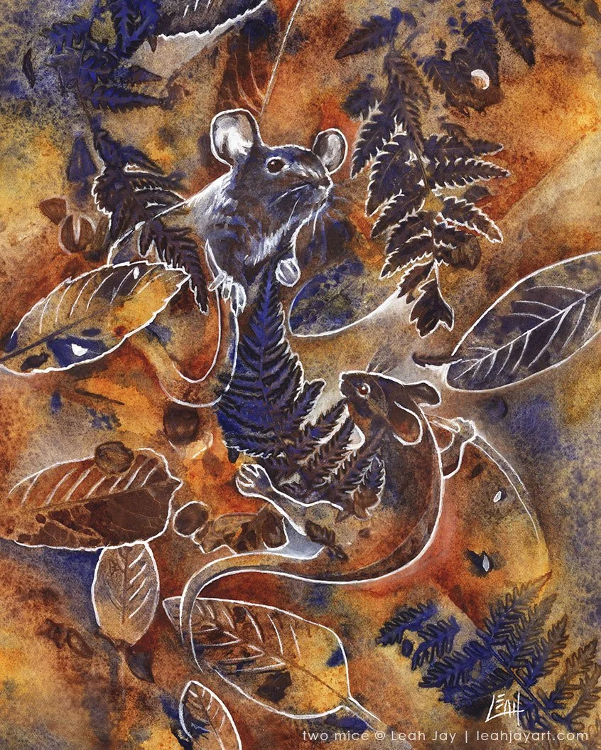 “Two Mice”, Watercolor and gouache, with impressions of leaves and ferns on paper, 8" x 10", matted and framed to 10" x 12". $135, Available at Village Gallery of Arts through October.