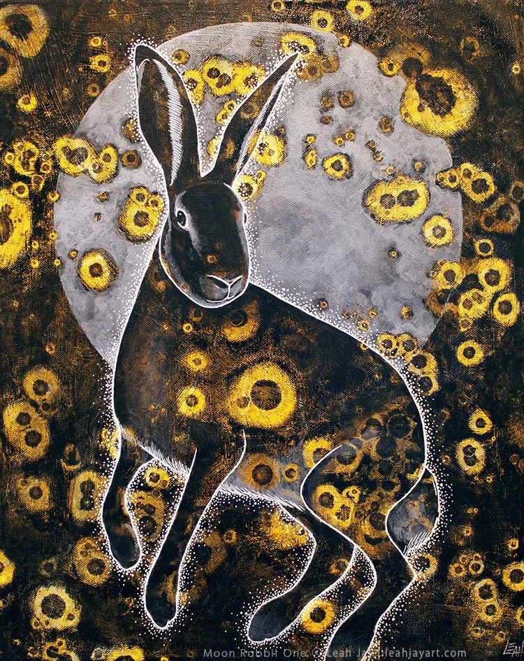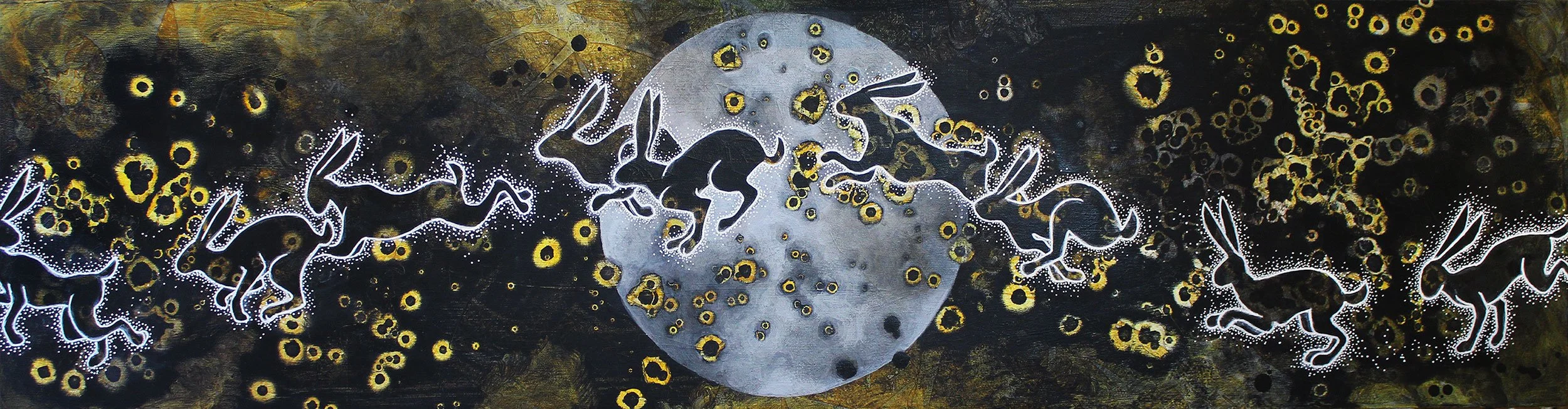 Hares bound from right to left (as Asian books are read), leaping into this big silvery lunar new year! This is “Moon Rabbit Run” - a 48” by 12” acrylic painting - come see it at Lan Su Chinese Garden in downtown Portland! The Year of the Rabbit show runs January 19th - February 21st.